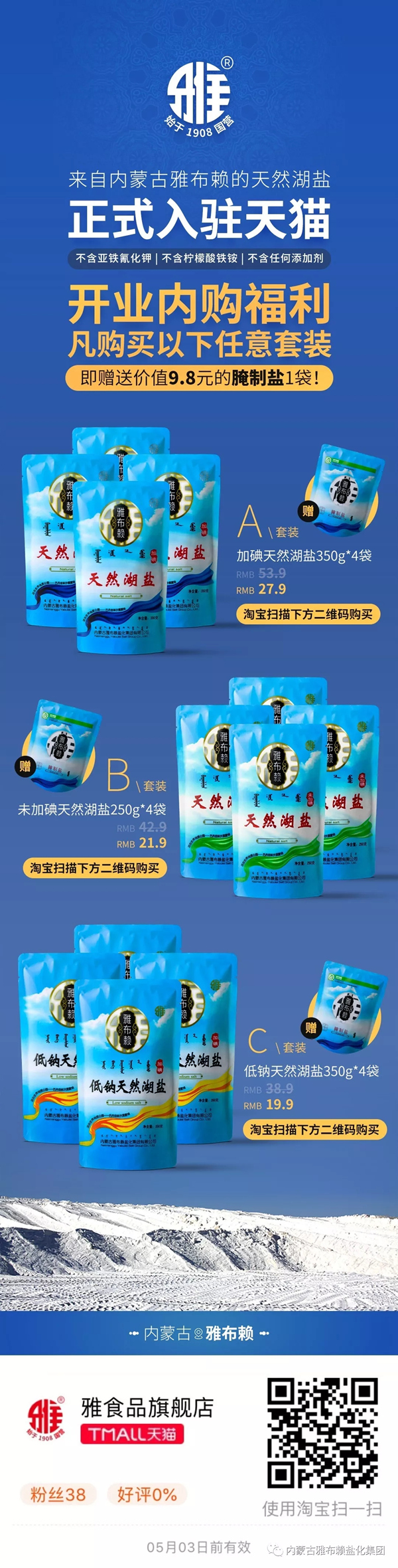 电商公司通过京东的层层严格审核,雅盐天猫旗舰店于4月1日隆重开业。自此,雅盐食用盐、洗涤盐系列8个单品全部上线销售,分别为:大青盐(320g)、低钠天然湖盐(350g)、未加碘天然湖盐(250g)、天然湖盐(350g)、腌制盐(400g)、精制盐(400g、2500g)、果蔬洗涤盐(320g)。 现在,消费者只需在淘宝输入“雅布赖盐”、“雅食品旗舰店”或使用淘宝扫描上图二维码,即可找到由米兰体育·米兰官方网站-米兰online(中国)
