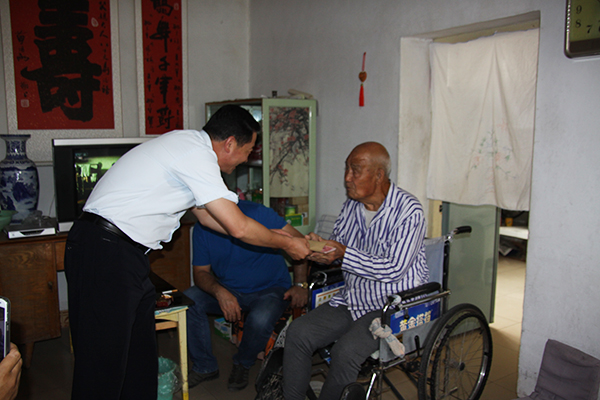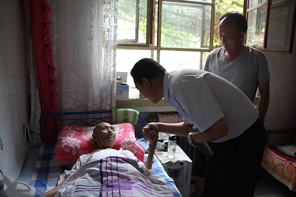 张宪坤详细询问崔文彪老同志的病情 在每位离休老同志的家中,张局长一行代表盟委、行署向老干部送上问候和祝福,关切地询问他们的身体情况和生活情况,深入了解他们的各项生活费用和医药费落实情况,并为每位老人送上1000元慰问金,祝愿他们保重身体,安享晚年。三位离休老人非常感动,对盟委、行署对他们的关心和厚爱表示感谢。
