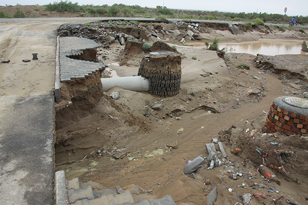 盐湖采区遭受污染 供销分公司库房房顶毁坏 精盐分厂粉盐品遭受雨水浸泡 镇区马路被破坏 居民院落外墙被泡塌 泄洪口被冲毁 集团公司盐湖受损最严重。山洪自西向东灌入正在生产的盐湖采区,不仅结晶池遭到污染,挖掘机归拢的盐品也全部溶化。已经生产出的半成品盐坨遭受暴雨清洗,仅雨水溶化的盐品近2千吨。精盐分厂刚刚生产的粉洗盐,虽及时苫盖,也没有躲过雨水浸泡,600吨成品报废。据统计,盐湖直接经济损失达500多万元。 因暴雨侵袭,采盐分厂部分院墙倒塌,供销分公司3间供应库房房顶毁坏,机运分厂和公司办公楼大面积漏水,供热分公司2000米暖气管沟遭到雨水漫灌,30处检查井损毁,几乎每个单位都受到重创。 由于公司部分职工居住的平房还是土木结构,山洪来袭,泄洪口排水不及,致使3家居民院墙被冲塌,1家居民小房子外墙被泡塌,另有3栋楼房地下室被山洪漫灌。100多户居民房屋漏水严重。危急时刻,政府相关部门及时组织疏散受灾群众,避免了人员伤亡。 山洪来势凶猛,小镇唯一的防洪渠跨马路部分被冲毁,镇区马路多处遭到破坏。